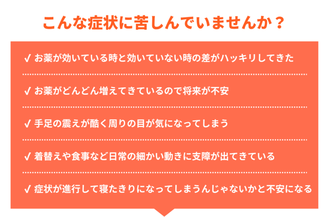 震え・筋肉のこわばり・動作の鈍さなど、パーキンソン病特有の症状が現れていきます。